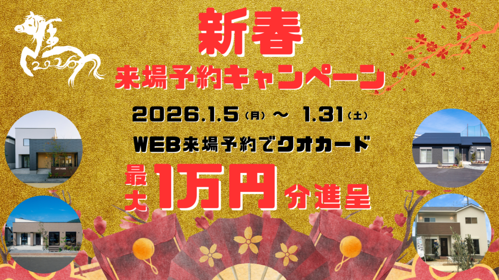 1/5(月)~1/31(土)の期間、新春来場予約キャンペーンを開催!WEB予約の上、ブエラハウスへ初めてのご来場でQUOカード最大1万円分をプレゼント!プレゼントの詳細は、下記の【キャンペーン概要】をご覧ください。ブエラハウスの嘉島住宅展示場、ブエラハウス光の森ショールーム、ジャストホームの熊本平屋展示場・合志平屋展示場・八代平屋展示場が対象会場です!詳細はキャンペーン概要をご覧ください。